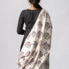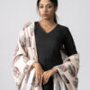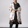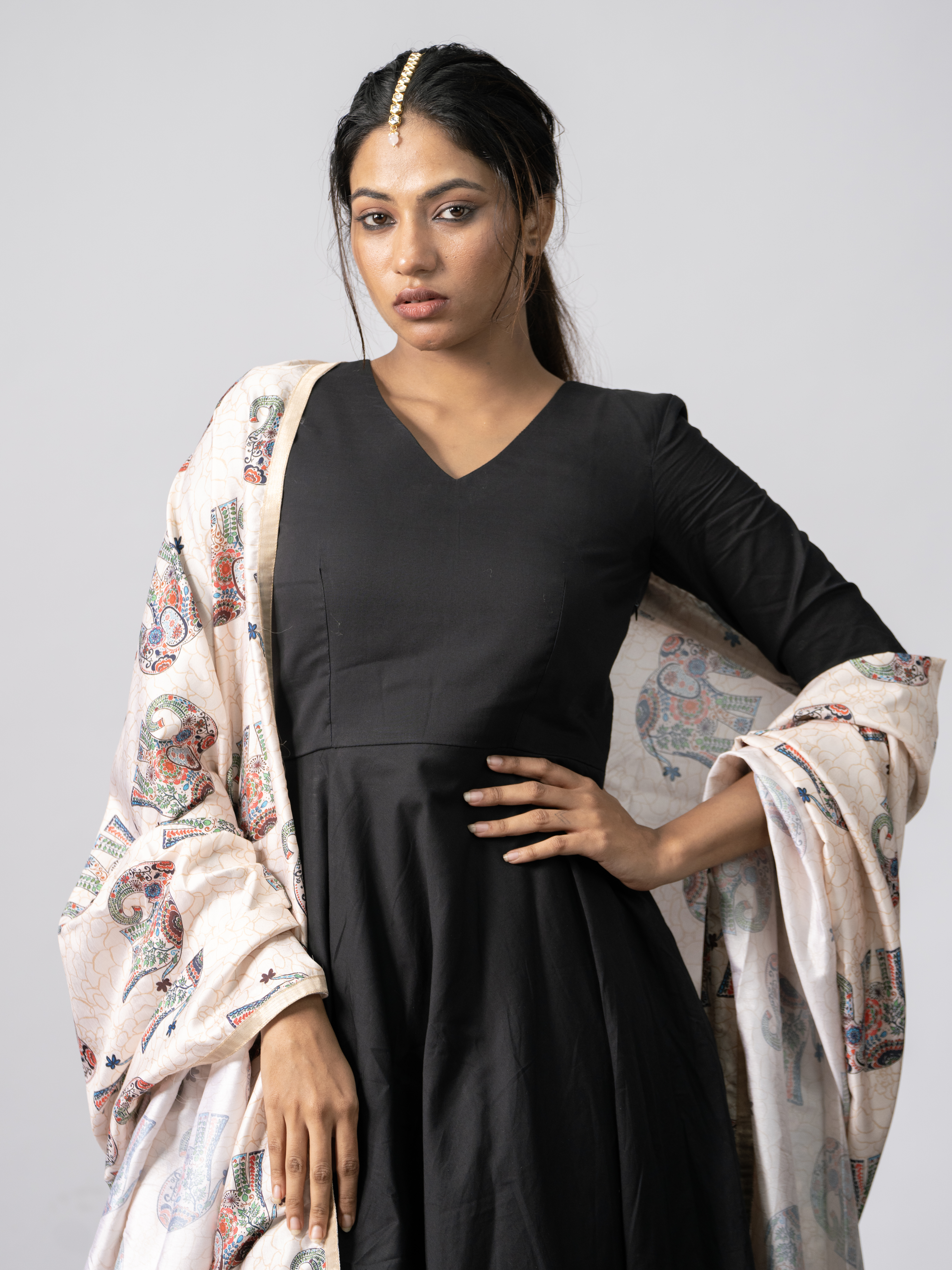 Design description: plain black anarkali with tussar silk printed dupatta with tassels